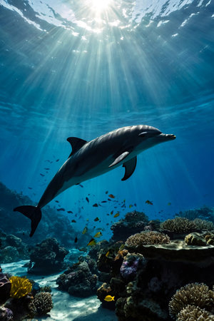 A stunning underwater scene featuring a dolphin swimming gracefully by a colorful coral reef. Sunlight filters through the water, illuminating vibrant marine life below.