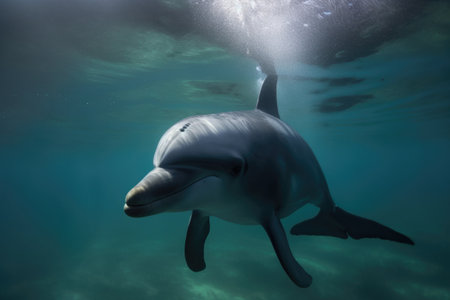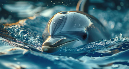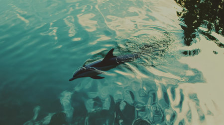 A stunning dolphin glides effortlessly through tranquil waters, creating beautiful reflections. This image captures the grace and beauty of marine life in a serene environment.
