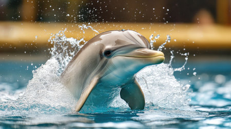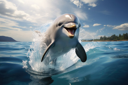 A playful dolphin jumping out of the water with a joyful expression, creating a splash as it returns to the ocean surface