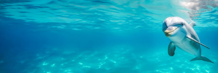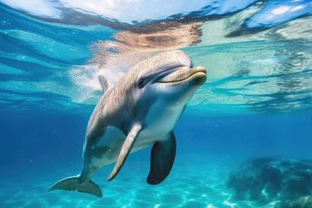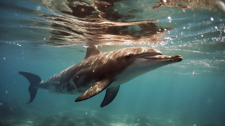 Captivating image of a dolphin swimming gracefully through crystal clear ocean waters, showcasing the beauty and playfulness of marine life in its natural habitat.