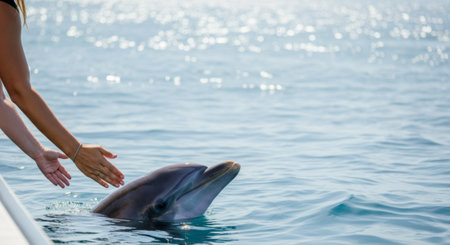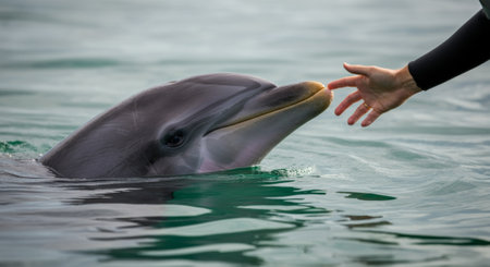 Hand reaching to touch dolphin in calm ocean water interaction scene.