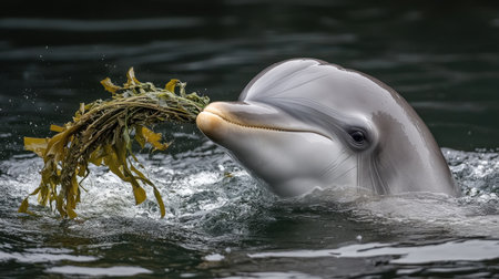 A captivating image of a dolphin swimming gracefully with a piece of seaweed in its mouth, showcasing the beauty and tranquility of ocean life.