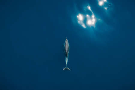 Dolphin (Delphinidae) mammal swimming in tropical underwaters. Silhouette Dolphin in underwater wild animal world. Observation of ocean wildlife. Scuba diving adventure in Ecuador coast. Copy space