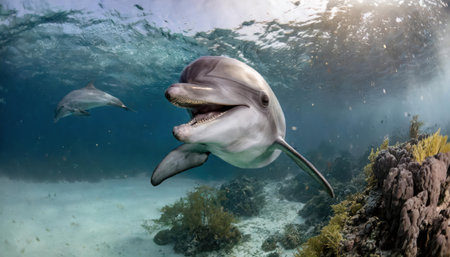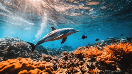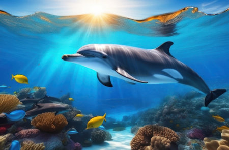 Dive into the vivid underwater world with this captivating AI generated image of a playful dolphin swimming amidst colorful coral reefs and vibrant marine life, basking in the sunlight. Generated A.I.