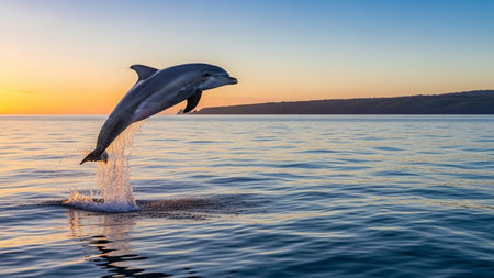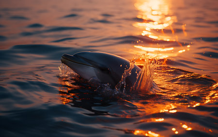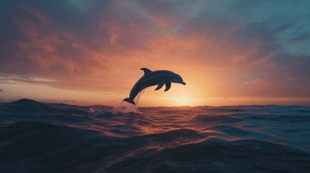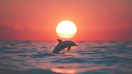 A stunning capture of a dolphin leaping from the ocean's surface at sunset, showcasing the beauty of nature with vibrant colors and a peaceful atmosphere.