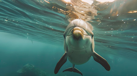 A stunning dolphin glides gracefully through the crystal clear water, showcasing the beauty of ocean life. The serene setting highlights the importance of marine conservation.