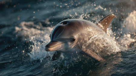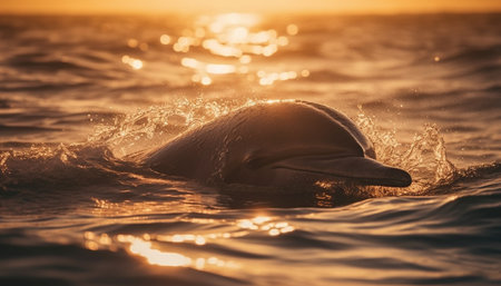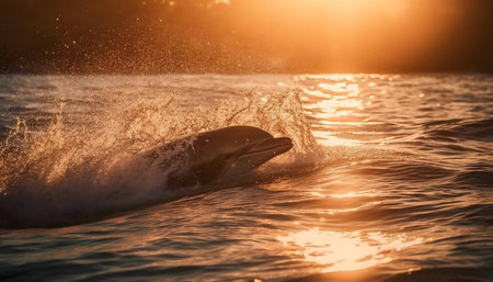 Dolphin leaping through ocean waves at sunset, sparkling water splashes and golden bokeh, wildlife and freedom concept.
