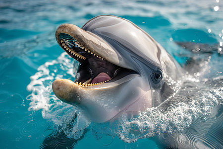 A dynamic shot of a dolphin breaching the surface with its mouth open, splashing water around, capturing the excitement and vitality of ocean life.