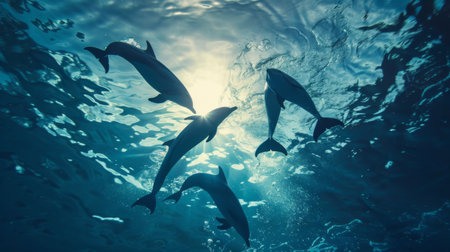 Pod of majestic dolphins swimming gracefully in the clear turquoise waters of the ocean. World Whale and Dolphin Day.