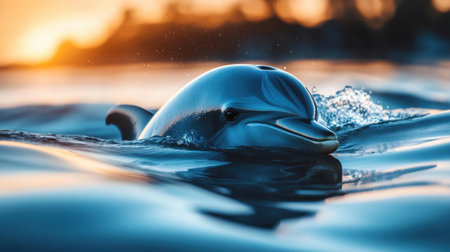 An AI generated illustration of a beautiful dolphin swimming in the tranquil water at sunset