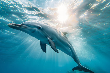 Depicting a dolphin swimming in the ocean with sunlight shining through. vibrant colors, studio lighting, taken with a sony ? iv camera and mm lens, in a low angle shot.