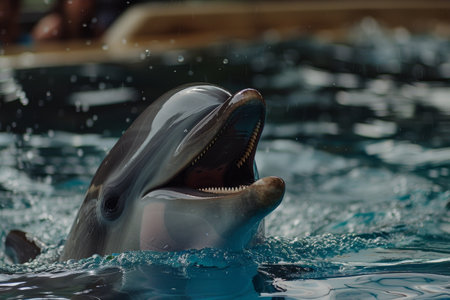 dolphin jumping out of the water and splashing with his mouth open