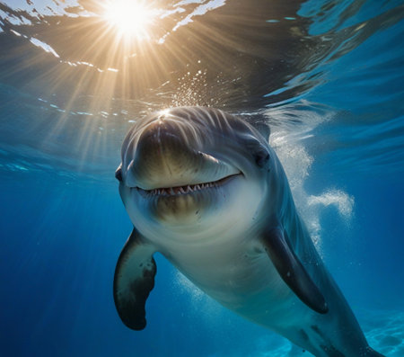A happy dolphin swimming in the ocean, its face reflecting joy and excitement.