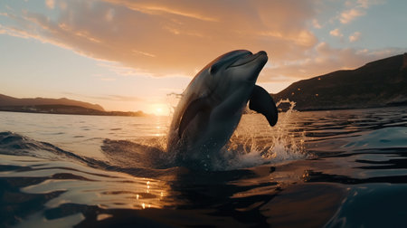 Dolphin leaping at sunset, golden light, ocean waves