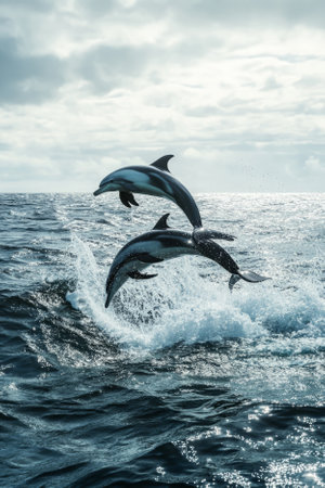 Experience the beauty of dolphins swimming in sync through ocean waves, showcasing their playful nature and the tranquil rhythm of marine life.