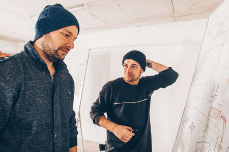 Life on the street. Two serious men standing in front of a graffiti wall.