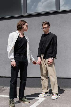 Handsome guy with fancy glasses in a stylish blue sweatshirt stands on the street hand in hand