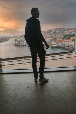 Person Admiring Porto Cityscape and Douro River at Sunset from Large Window