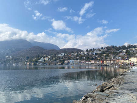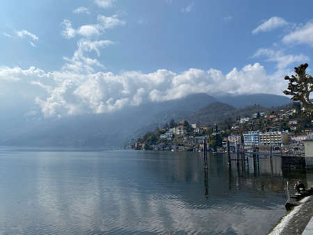Alpine lake Maggiore with mountains in Locarno, Ticino Canton, just across the international border between Switzerland and Italy (Piedmont region, Province of Verbano Cusio Ossola)