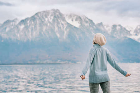 Outdoor portrait of young happy woman enjoying amazing mountain landscape, back view