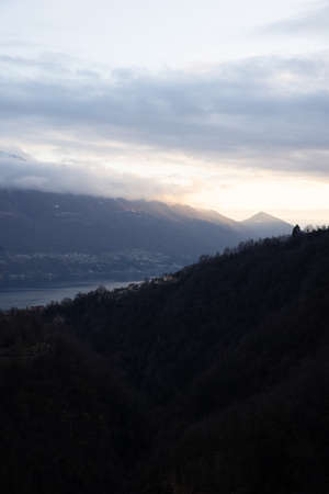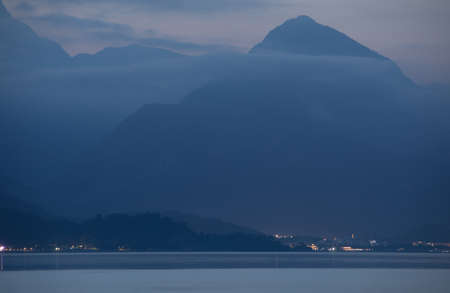Photo of foggy mountains in Como lake in Lombardy, Italy. Sunset view over the mountain