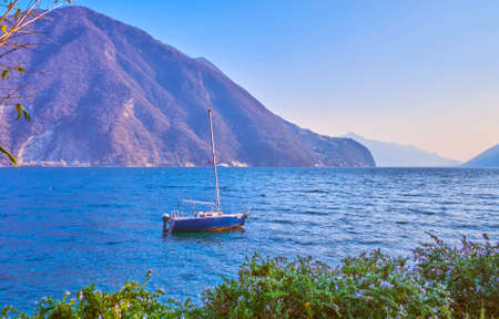 The view on the blue yacht at the shore of Lugano Lake at Villa Helemeun park with blooming rosemary bushes, Lugano, Switzerland