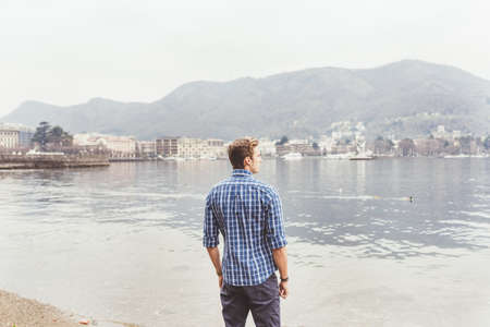 Young man looking out from lakeside, Lake Como, Italy