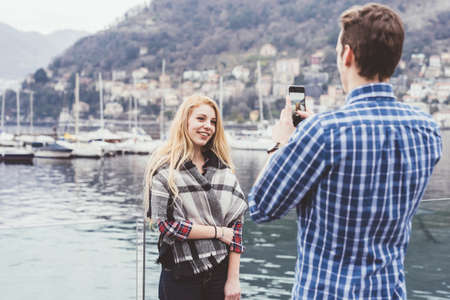 Young man on waterfront photographing girlfriend, Lake Como, Italy