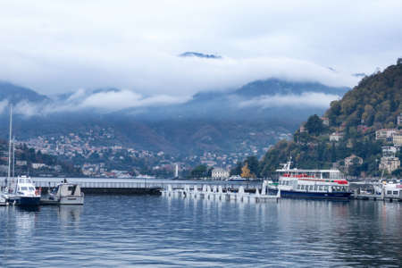 Como, Italy, November 2021. Beautiful view of the lake and the city of Como in the Lombardy region of Italy on a cloudy day. Travel Italy.