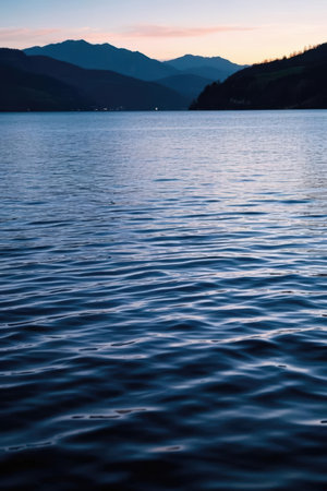 Mountains reflected in the calm water of a mountain lake at sunset