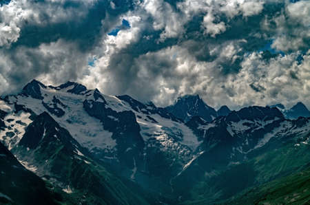 Gloomy mountain top landscape with thunder cloudy sky, rocky ranges and peaks with glaciers and snow fields. Rainy day in wild nature. Belalakaya, Dombay, Caucasus