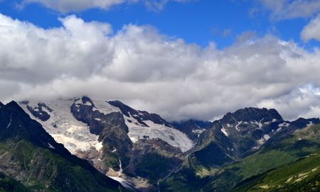 Mountain peaks in Dombai Summer in cloudy weather