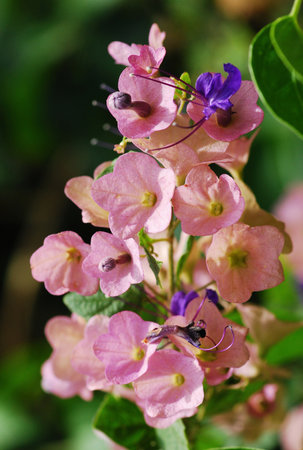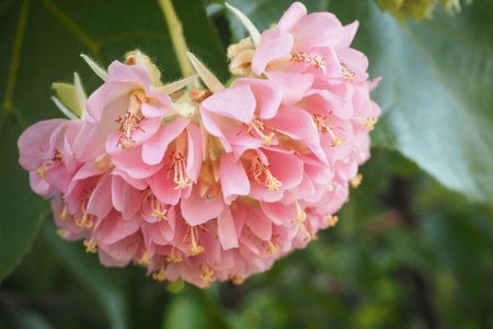 Macro of beautiful flowers, Rose Clerodendrum (Burma Conehead), in soft color and soft blurred style, on green leaves blur background, in Thailand.