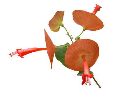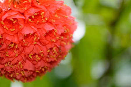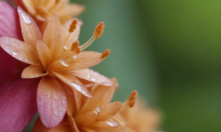 Closeup of Pagoda Flower Clerodendrum paniculatum tropical flowers with soft peach petals and red stamens in natural floral background