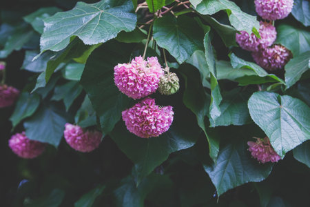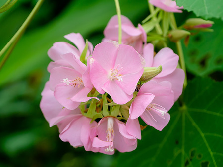 A soft focus of pink dombeya flowers surround with green leaves at a garden