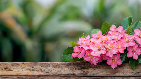 Pink flowers on wooden table with nature background, soft focus and copy space.