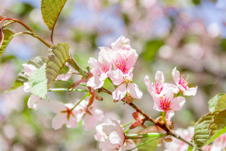 Pink flowers of Japanese cherry blossoms with bokeh background.