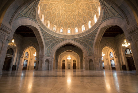 Empty main hall in an Islamic mosque features a grand central dome with intricate geometric patterns arches and chandeliers creating a serene atmosphere for prayer and reflection with natural light filtering through windows
