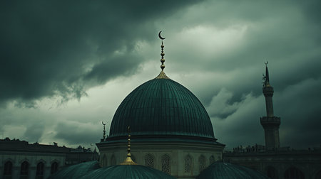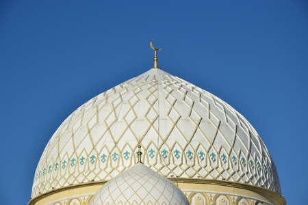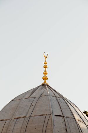 Mosque dome with crescent moon. Muslim holy place. Religious architecture.