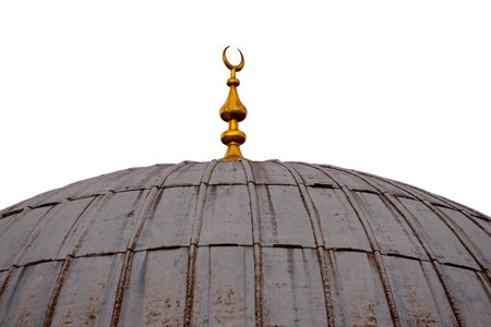 Rustic dome of an old mosque with a crescent, isolated on white, islamic architecture