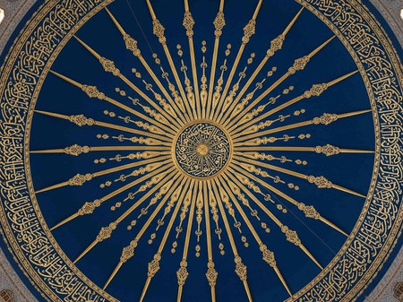 A stunning blue and gold dome with intricate Arabic calligraphy design