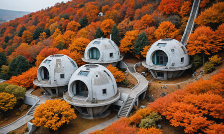 A cluster of dome-shaped homes sits nestled amongst a hillside of vibrant orange and yellow leaves in autumn