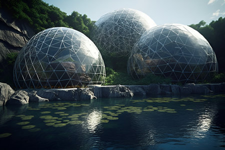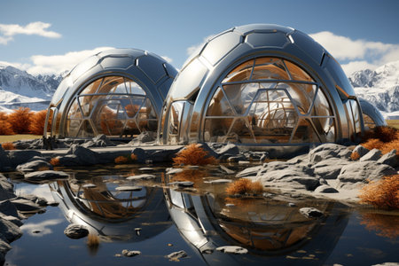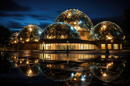 A view of modern architectural structures, characterized by their sleek glass domes and geometric reflected perfectly in a calm body of water. The scene is set during sunset, with a warm, golden sky casting a soft glow over the buildings. The water's surface is still, creating a mirror-like reflection that doubles the visual impact of the impressive architecture. evokes a sense of wonder and sophistication, highlighting innovative and urban beauty.