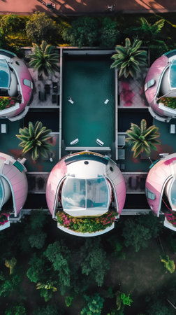 Stunning aerial view of a circular park structure adorned with lush greenery, offering a peaceful and vibrant urban oasis for relaxation and recreation.