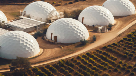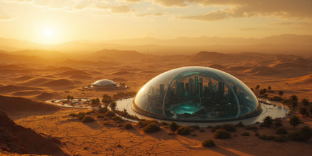 A futuristic glass dome city in the middle of a desert for sci-fi and innovation visuals. A sprawling city encased