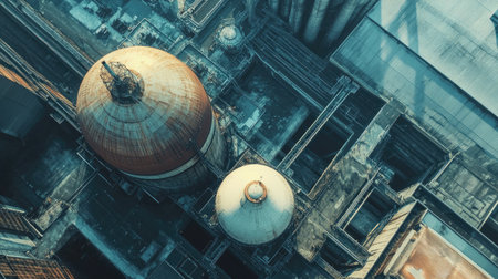 Captivating aerial shot showcasing an industrial facility with two large storage silos surrounded by intricate machinery and structures. The image highlights modern engineering and urban landscape.