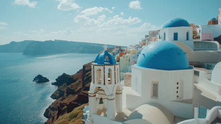 A high-angle shot of the blue-domed Orthodox Church in Oia, Santorini, surrounded by charming white buildings, with the sea and cliffs in the background