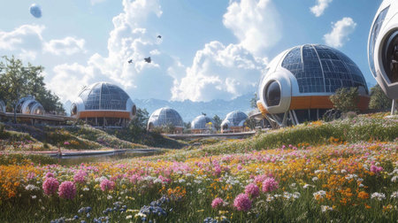 Circular homes adorned with solar panels blend harmoniously with fields of colorful flowers. Floating footbridges connect the tranquil village, set against a backdrop of gentle mountains.
