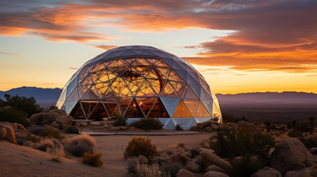 geodesic dome in the middle of Joshua Tree National Park at sunset