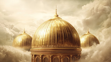 Image features three golden domes emerging from a sea of clouds. The composition has an aerial perspective, with warm tones and soft lighting. The scene creates a feeling of peace. Suitable for editorial illustrations, spiritual concepts or as an element for design projects.